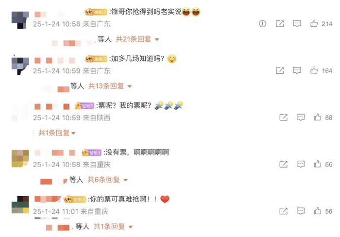 演唱会优先购票开启后,门票随即被秒杀,开售前平台预约人数就已经突破100万。粉丝纷纷吐槽“抢不到票”,要求加场,还有粉丝留言:“锋哥你抢得到吗老实说?”