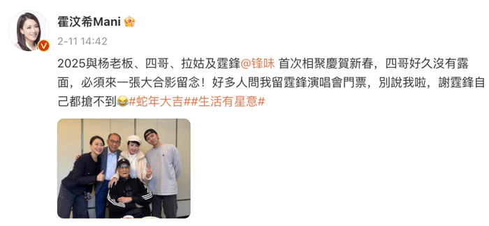 英皇高层霍汶希也在社交平台发文表示很多人问她要演唱会门票,但“谢霆锋自己都抢不到”。