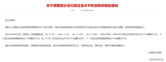 据公告,自2025年4月25日(星期五)收盘清算时起,Au(T+D)、mAu(T+D)、Au(T+N1)、Au(T+N2)、NYAuTN06、NYAuTN12等合约的保证金水平从12%调整为13%,下一交易日起涨跌幅度限制从11%调整为12%;Ag(T+D)合约的保证金水平从15%调整为16%,下一交易日起涨跌幅度限制从14%调整为15%。