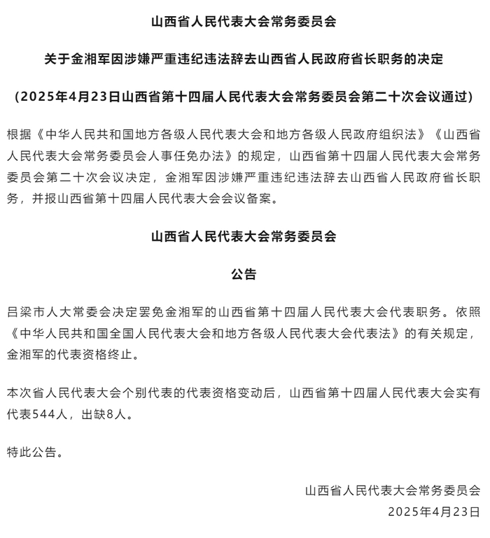 山西新闻联播消息,2025年4月23日山西省第十四届人民代表大会常务委员会第二十次会议通过:根据《中华人民共和国地方各级人民代表大会和地方各级人民政府组织法》《山西省人民代表大会常务委员会人事任免办法》的规定,山西省第十四届人民代表大会常务委员会第二十次会议决定,金湘军因涉嫌严重违纪违法辞去山西省人民政府省长职务,并报山西省第十四届人民代表大会会议备案。