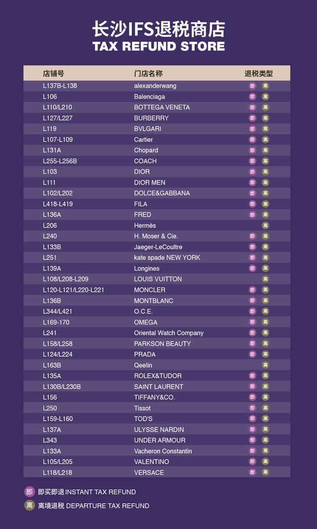 长沙IFS首批“即买即退”品牌覆盖重奢、轻奢、珠宝钟表、化妆品、运动、生活方式等多元业态,含alexanderwang、BURBERRY、BVLGARI、Cartier、COACH、DIOR、Fila、O.C.E.、PARKSON BEAUTY、ROLEX&TUDOR、UNDER ARMOUR等超30家品牌,全面满足境外旅客多样化消费需求。