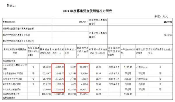 此外,根据4月18日披露的2024年度募集资金使用专项报告,截至2024年末,IPO募投项目仅游戏机核心零部件扩产项目和补流项目投入进度过半,原定今年7月完成的募投项目存在延期风险。