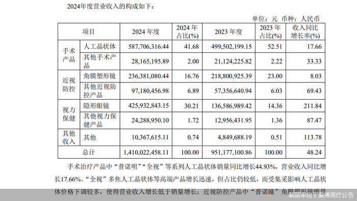 爱博医疗在2024年年报中表示,视力保健业务中以隐形眼镜产品为主的行业毛利率低于公司手术治疗和近视防控业务水平,加之该业务仍处于产能扩张期及合格率提升期,单位成本偏高,从而影响了公司整体净利润增速。