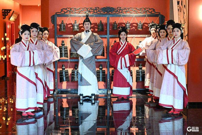 “日月所临,四溟当为同域!礼成——请君举杯此羹美酒!”战国时期,田单火牛破阵,以即墨一隅复兴齐国社稷,至齐威王即位,临淄终现鼎盛之姿。伴随着响亮的解说词,兰齐宫宴的序章《齐礼迎宾》的表演便徐徐铺展。像这样展示胶东半岛千年前的历史文明的舞蹈与礼仪贯穿整场,比比皆是,从火牛阵、到汉武帝东巡琅琊、到板桥镇启航丝绸之路,地域传奇故事融入其中,如同一座“活”起来的地区历史博物馆,观演出便可感受到青岛悠久发展脉络,感知历史沉淀。