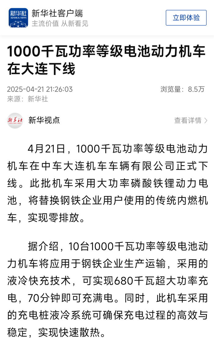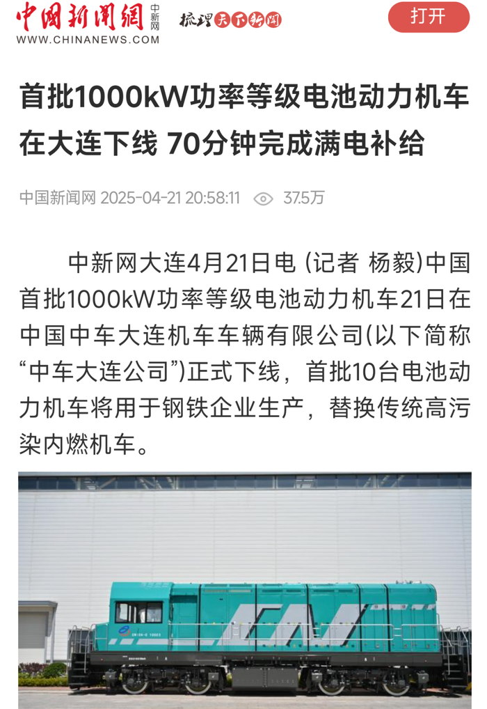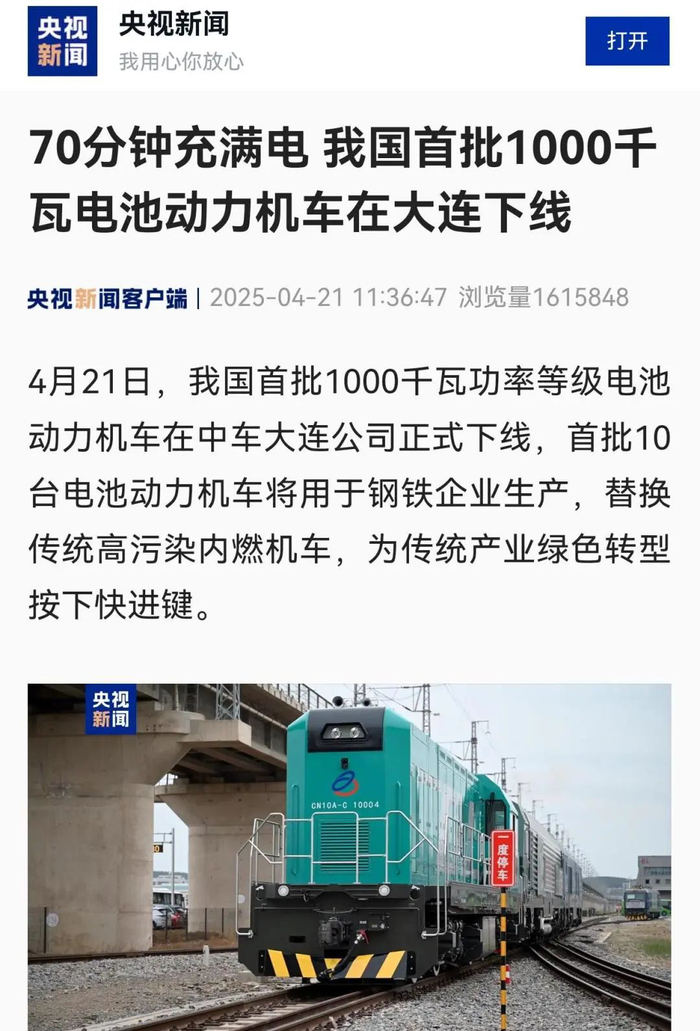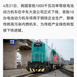 4月21日,中国中车为广东中南钢铁股份有限公司(以下简称“中南钢铁”)研制的系列化1000kW功率等级电池动力机车成功下线,吸引了央视新闻、新华社、科技日报等中央媒体,以及地方主流媒体的关注。