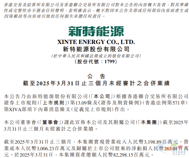 今年一季度,新特能源实现营业收入31.99亿元,营业成本为30.06亿元,归属于上市公司股东的净亏损为2.63亿元。截至2025年3月31日,新特能源资产总额为822.98亿元。