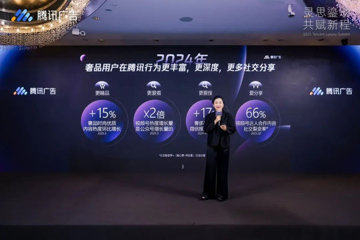 对于中国消费者的心智教育,始终贯穿中国奢侈品市场的经营实践。腾讯广告在「2025腾讯奢侈品峰会」上,分享了最新的奢侈品消费用户洞察:奢侈品用户在腾讯生态内的行为,更丰富、更深度,产生了更多社交分享。体现在奢侈品时尚类优质内容的热度和奢侈品微信搜索量增长,以及基于视频号热度走高所带来的达人合作内容社交裂变率的增长,2025年第一季度高达66%。