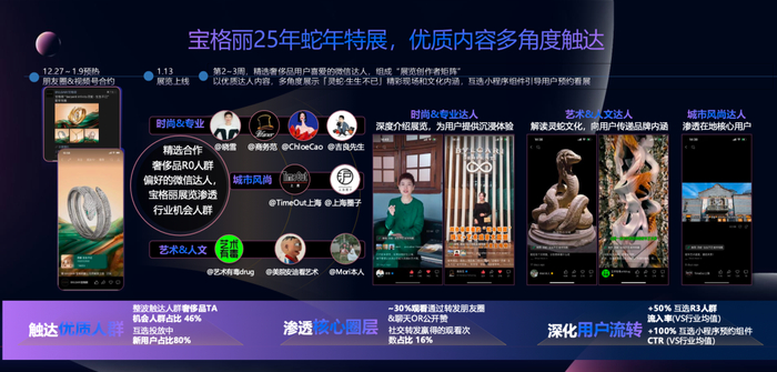 BVLGARI的25年蛇年特展就是一个很好的例子。BVLGARI以高品质内容串联朋友圈、视频号等触点,联动达人输出文化解析,同步植入搜索话题与预约链接,并以品牌小程序预约承接。活动最终触达46%奢侈品机会人群,互选小程序预约转化超行业均值100%,很好地实现了品效合一。