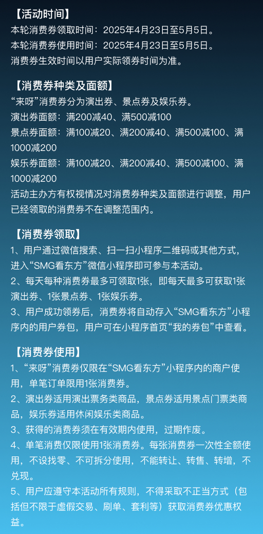 本次领券只需进入【SMG看东方】小程序,在【首页】点击「活动领券」按钮,即可进入领券页面。