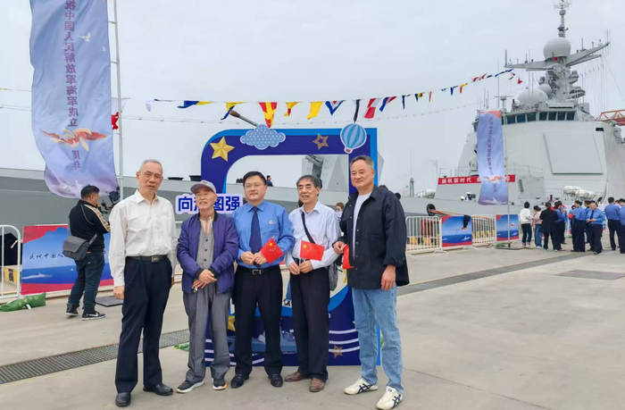 第一次近距离参观军舰,78岁的曹文光直呼“太幸福了”,专门来到舰艏合影留念,感受“水兵母亲城”的荣耀与幸福。