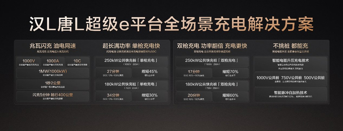 其中,凭借超级e平台全域千伏架构,汉L EV、唐L EV双车同时拿下中汽中心“极速充电之星”的权威认证!新车拥有10C全球量产最大充电倍率,1000kW全球量产最大充电功率,兆瓦闪充,油电同速,闪充5分钟,畅行400km,让服务区充电从人等车变车等人!兆瓦闪充,油电同速,实实在在地解决了充电速度这一纯电动车的最后短板,汉L、唐L更重新定义20万级纯电动车的技术标准!