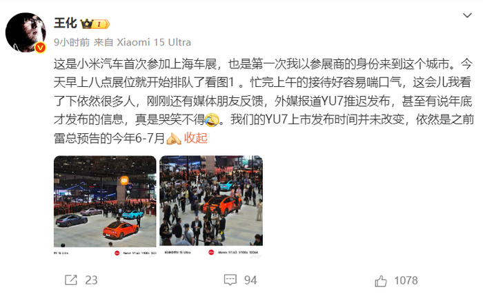 王化澄清:小米汽车YU7未推迟,年底发布系谣言
