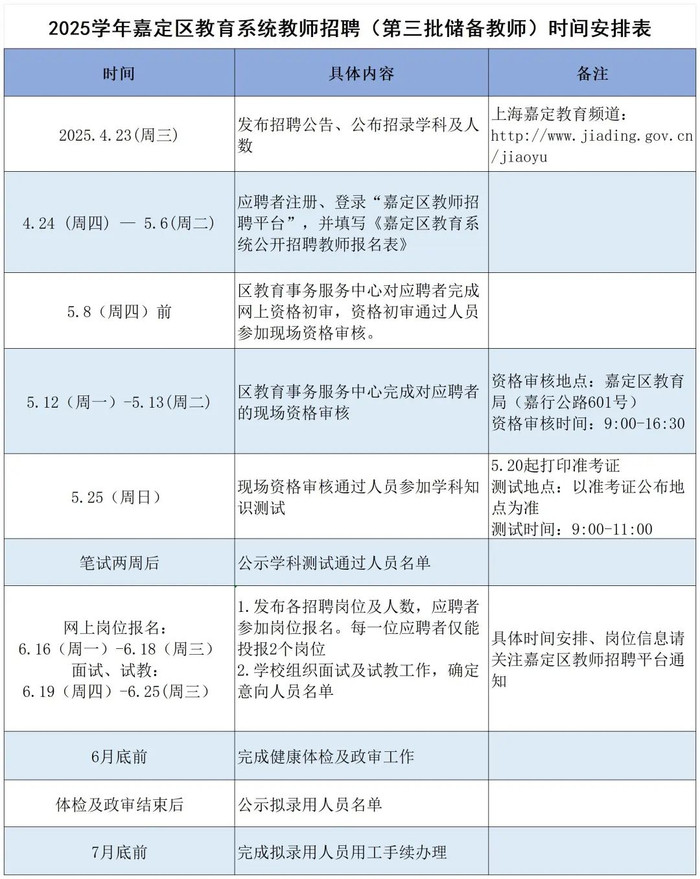嘉定区新闻办介绍,嘉定区教育系统启动2025学年第三批教师招聘,本次计划面向社会公开招聘储备教师98名(具体以岗位报名时推出的岗位数为准)。有意者可以通过上海嘉定教育频道(http://www.jiading.gov.cn/jiaoyu),或直接输入一网通办报名网址(https://zwdt.sh.gov.cn/govPortals/bsfw/item/8d967296-c2e2-48ea-9023-c568dc8990ad)报名。报名时间为4月24日至5月6日。详见↓