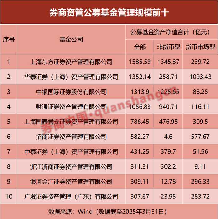 Wind数据显示,截至2025年一季度末,共有4家券商资管机构的公募基金资产管理总规模超千亿元。东方红资产管理以1585.59亿元排名第一,华泰证券资管以1352.14亿元排名第二,中银证券、财通证券资管分别以1313.9亿元、1056.83亿元排名第三、第四。随后是国泰君安资管(786.45亿元)、招商证券资管(582.27亿元)、中泰证券资管(431.25亿元),分列第五至第七,浙商证券资管、银河金汇、广发证券资管也居于前十。
