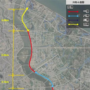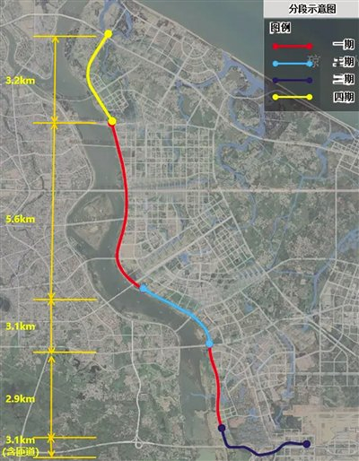 该项目起点为江东大道,终点至绕城高速段,全程17.9公里,共分四期建设。其中一期为文明东隧道-椰海大道段、南渡江大道-进出厂路,长度为8.5公里;二期为椰海大道-南渡江大道段,长度3.1公里;三期为进出厂路-绕城高速段,长度3.1公里;四期(远期)为江东大道-文明东隧道段,长度3.2公里。