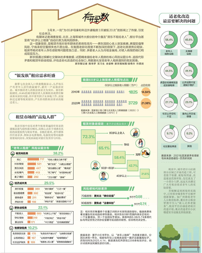 新京报通过拆解社交媒体的多维数据,试图精准描绘老年人租房的核心风险议题分布,追踪代际矛盾和租赁年龄歧视链,评估适老化改造的社会缺口,用数据化呈现老年人租房遇到的现实困境。新京报记者 陈华罗 实习生 余姿桦 新京报制图/苗奇卉 许英剑