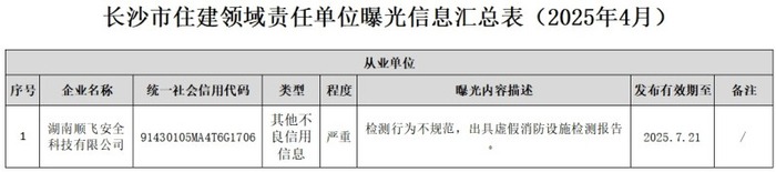根据《长沙市住建领域责任单位曝光信息汇总表(2025年4月)》,本次被曝光的是湖南顺飞安全科技有限公司,曝光内容为“检测行为不规范,出具虚假消防设施检测报告”,类型为“其他不良信用信息”,程度“严重”,发布有效期至2025年7月21日。