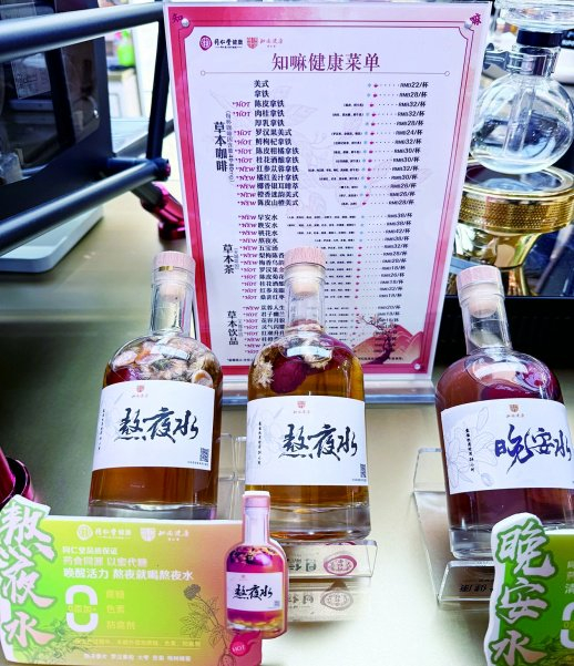 随后,记者又来到网络平台上被众多年轻人推荐的中式推拿馆,一进店铺就发现,店内提供“枣仁安神茶、雪梨清润茶、茯苓祛湿茶”三款中药饮品供消费者免费饮用。店铺工作人员表示,三款茶饮均标明了中药材成分,记者饮用的枣仁安神茶就包含枣仁、芡实、莲子、黄精、大枣、百合,适合有失眠困扰的人群饮用。