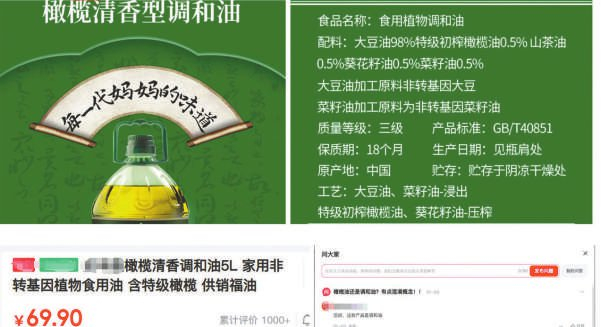 二是虚标主油种类或配料表顺序作假。调和油包括多种配料,但某些调和油的标签却只突出一种价格较高的配料名称。如某品牌“橄榄清香型调和油”,“橄榄”字样醒目,容易让人误以为是以橄榄油为主调配的食用油,但如果仔细阅读配料表,就会发现橄榄油实际占比仅0.5%;还有的标签有意将“递减”的顺序打乱,将价格高但实际用量少的配料排在前列,如某品牌调和油配料表标注“花生油、大豆油”,但花生油占比可能不到10%,而排在后面的大豆油占比能高达80%。