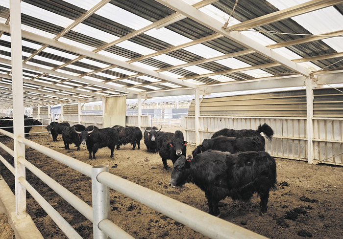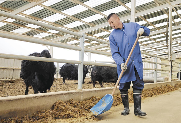 4月22日清晨,走进海东市平安区富硒牦牛产业示范园区,标准化钢结构的养殖大棚鳞次栉比坐落在山腰上,在养殖区2号棚内,身着藏蓝工作服的饲养员正给牦牛投喂科学配比的饲草料,现代化的养殖大棚干净整洁,圈舍内膘肥体壮的牦牛群悠闲咀嚼饲草,油亮的黑色毛发在晨光中泛着光泽。据了解,该园区共占地面积1225亩(1亩约0.067公顷),园区内现有高标准牦牛养殖棚圈66栋,可同时容纳1万头牦牛的养殖,是目前青海省最大的富硒牦牛产业基地。目前,园区运营工作由青海华丰高原富硒农产品开发有限公司负责,采用“集中管理,分户经营”的运营模式,并通过土地流转、饲草种植加工带动、入园养殖、灵活就业、利润分红等,不断带动周边农户创收增收。本报记者 李庆玲 摄