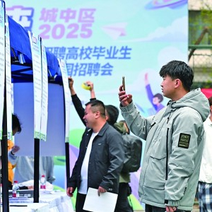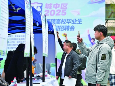 4月23日,青海建筑职业技术学院举行2025届高校毕业生建筑、通信行业专场招聘会,共有45家用人单位提供1700多个岗位,吸引众多应届毕业生前来应聘。图为学生在校园招聘会上查看企业招聘需求。新华社记者 齐芷玥摄
