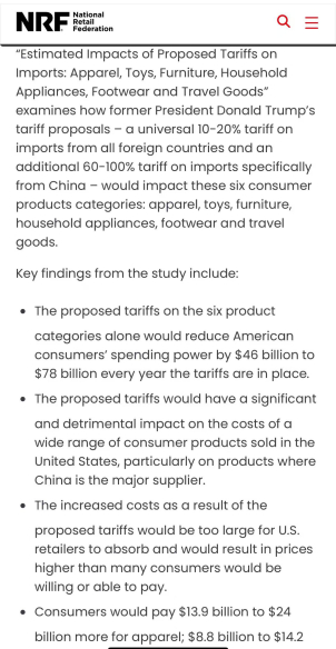 虽然我们不知道这次讨论具体谈得如何,但美国零售联合会在2024年11月就给出过一份报告,详细分了关税对于服装、玩具、家电、鞋履和旅行用户这6类产品的影响。
