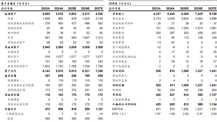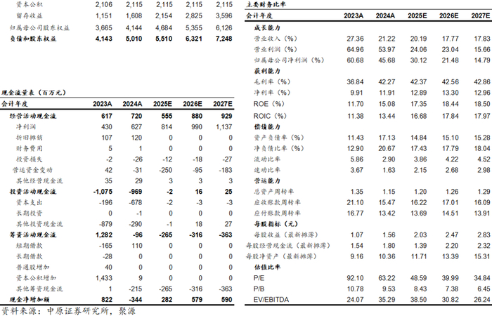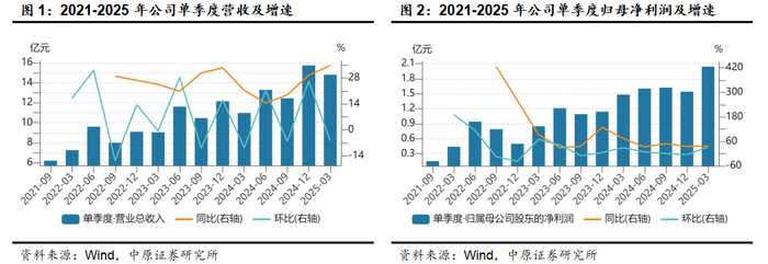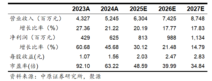 公司业绩符合预期,维持快速增长。根据公司公告,2024年总营收52.45亿元,同比+21.22%;实现归母净利润6.25亿元,同比+45.68%;扣非后归母净利润6.00亿元,同比+42.08%;经营性现金流量净额为7.20亿元,同比+16.60%。其中,2024Q4公司营收为15.73亿元,同比+29.55%;归母净利润1.54亿元,同比+34.78%。2025Q1公司营收为14.80亿元,同比+34.82%;归母净利润2.04亿元,同比+37.68%;扣非后归母净利润1.99亿元,同比+44.20%。2024年末,公司拟向全体股东每10股派红利2.5元(含税),2024年度公司累计现金分红总额为2.00亿元,占归母净利润的32.02%。