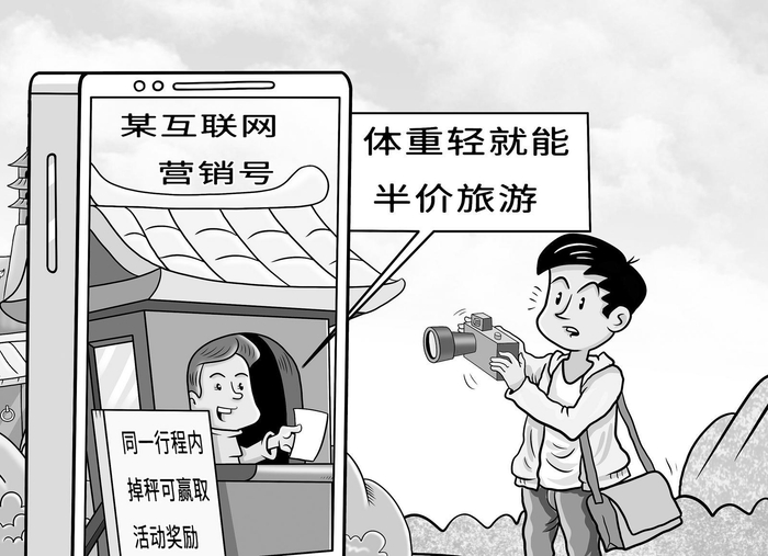 眼下,正值出游高峰,互联网营销号频繁出现“双人出游体重300斤以下,可享受当地景区门票减半优惠”等信息。多地文旅部门辟谣信息发布后,“景区门票优惠与游客体重挂钩”的消息依然在网上流传。随着“不合理低价游”屡屡被曝光,部分违规经营者揽客方式也出现了新变化,铺天盖地的“体重轻能获旅行优惠”正是新套路之一。消费者在选择旅行团时,应理性比价,警惕过于离谱的低价。明显低于市场价的行程必有隐藏成本,包括强制购物等。