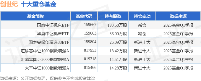 持有创世纪最多的基金为国泰中证机床ETF,目前规模为4.59亿元,最新净值1.0655(4月23日),较上一交易日上涨2.5%,近一年上涨20.8%。该基金现任基金经理为苗梦羽。