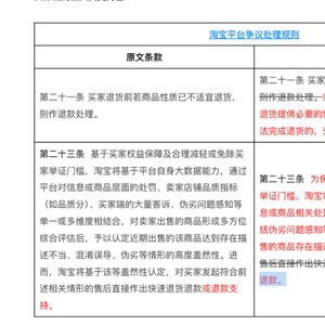 例如,在淘宝公布的《关于平台优化售后服务保障相关举措的意见征集》中,“买家退货前若商品性质已不适宜退货,则作退款处理”条款被变更为:“买家退货前若商品性质已不适宜退货,或买家退货存在困难,卖家应为买家退货提供必要的协助,卖家未协助或卖家协助后仍无法完成退货的,交易支持退款。”