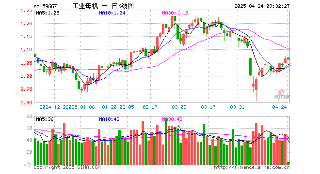 4月24日,工业母机ETF(159667)开盘涨0.38%,报1.069元。工业母机ETF(159667)重仓股方面,华工科技开盘跌0.23%,豪迈科技涨0.00%,大族激光涨0.42%,汇川技术涨0.30%,厦门钨业涨0.05%,中航高科跌0.13%,绿的谐波跌0.56%,创世纪跌0.35%,柏楚电子涨0.00%,江特电机涨1.15%。