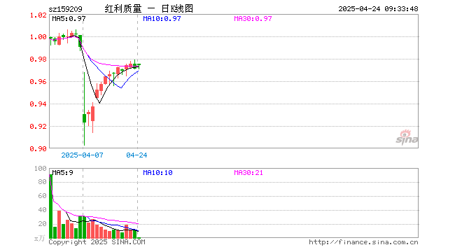 4月24日,中证红利质量ETF(159209)开盘涨0.41%,报0.975元。中证红利质量ETF(159209)重仓股方面,贵州茅台开盘涨0.00%,中国平安涨0.00%,中国神华跌0.10%,中国太保跌0.10%,水晶光电跌0.05%,山金国际涨0.58%,福耀玻璃跌0.26%,亿联网络跌0.71%,西部矿业跌0.19%,格力电器涨0.00%。
