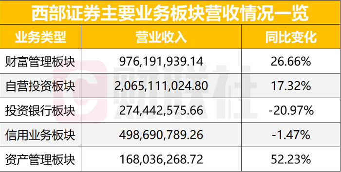 从业务占比来看,自营业务成为西部证券业务收入的压舱石,而资管业务表现也同样突出,成为去年增幅最大的业务管理板块。