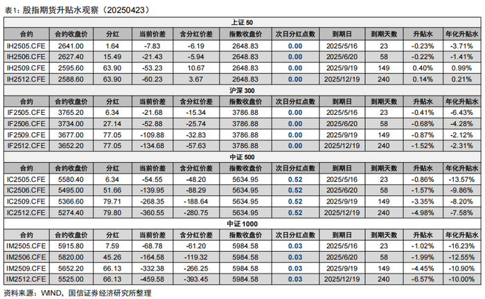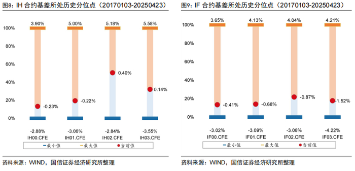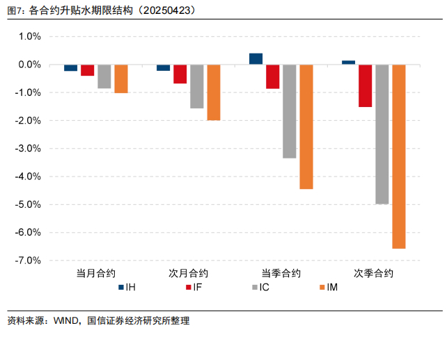 截至2025年4月23日,IH主力合约年化贴水3.71%,IF主力合约年化贴水6.43%,IC主力合约年化贴水13.57%,IM主力合约年化贴水16.23%。