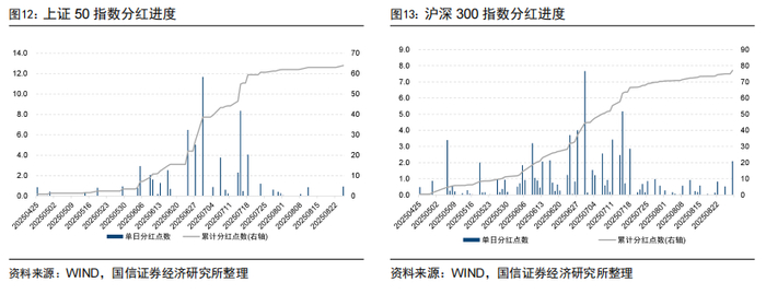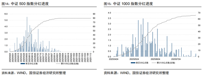 为了更加详细地展示各指数的分红进度,图12-图15分别展示了上证50指数、沪深300指数、中证500指数和中证1000指数的预测分红进度,可以看到成分股分红基本分布在8月。