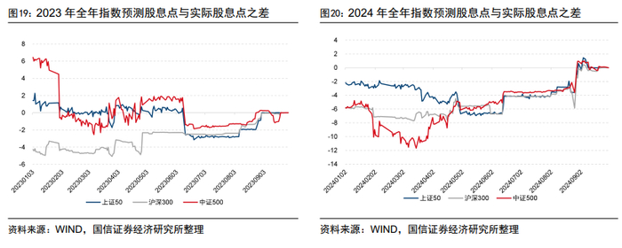 下面,我们对具体的股指期货预测股息点与实际股息点之间的偏离进行检验。图21-图26分别展示了2023年及2024年上证50、沪深300及中证500股指期货当月主力合约的预测股息点与实际股息点,其中期货合约的实际股息点我们以当前时间到期货合约到期日之间对应的股息点指数作为代替。