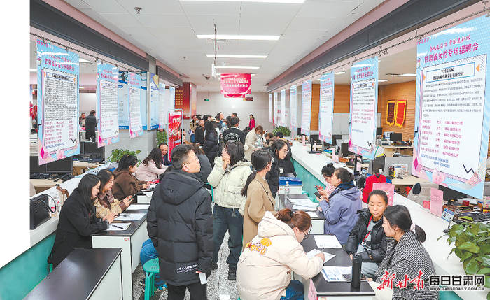 “春风送岗位·巾帼建新功”甘肃省女性专场招聘会现场,152家优质企业提供上万个岗位,吸引了6000余名求职者入场。用人单位详细展示岗位需求、薪资待遇等情况,求职者边走边看,寻找心仪的岗位。展位前,求职者与招聘人员交流热络……