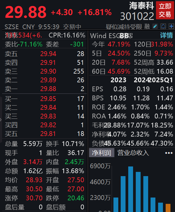 一季度净利润同比增长5739%,海泰科大涨超16%