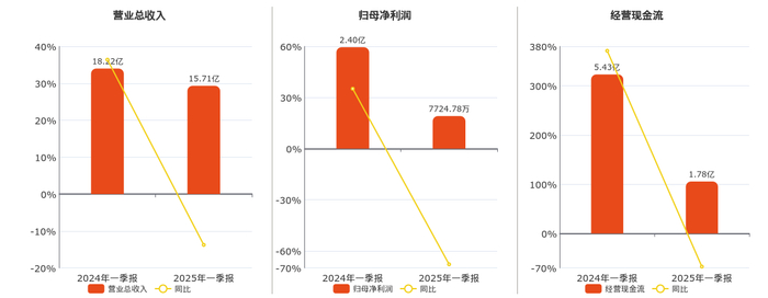 公司营业总收入为15.71亿元,较去年同报告期营业总收入减少2.51亿元,同比较去年同期下降13.76%。归母净利润为7724.78万元,较去年同报告期归母净利润减少1.63亿元,同比较去年同期下降67.88%。经营活动现金净流入为1.78亿元,较去年同报告期经营活动现金净流入减少3.66亿元,同比较去年同期下降67.31%。