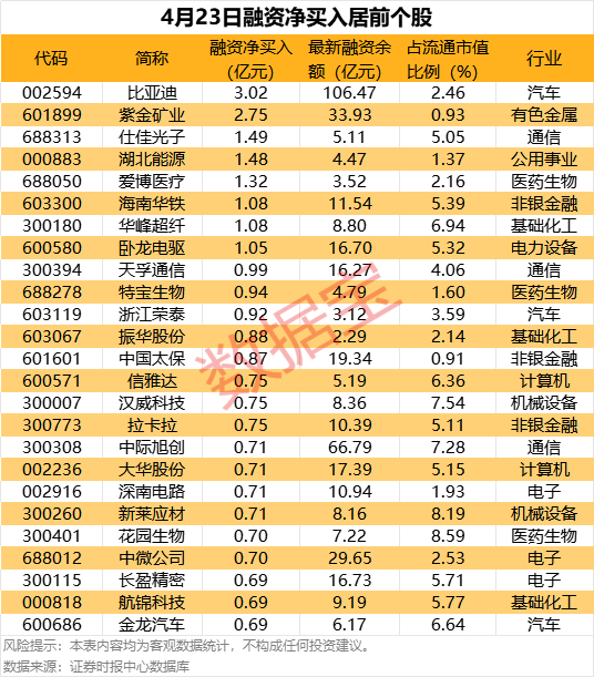 具体到个股,4月23日获融资净买千万元以上的有360股,其中39股融资净买入额超5000万元。比亚迪融资净买入额居首,当日净买入3.02亿元;其次是紫金矿业仕佳光子,融资净买入金额分别为2.75亿元、1.49亿元;融资净买入金额居前的还有湖北能源爱博医疗海南华铁等。