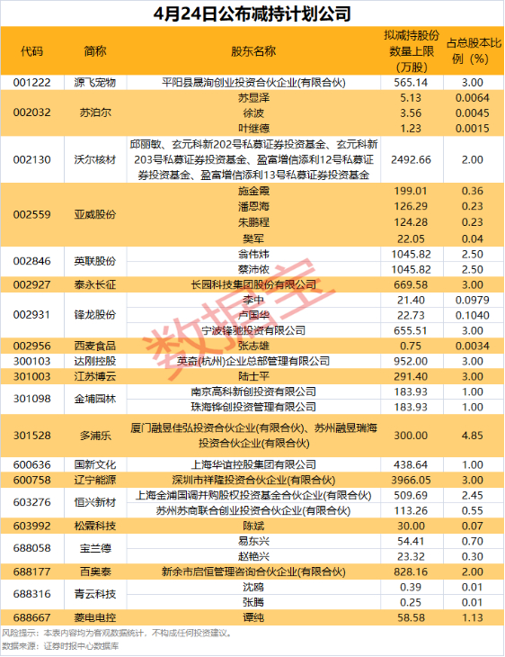 4月24日,共20家公司公告股东减持计划,是4月份公告减持计划较多的一天。从减持比例来看,拟减持比例居前的有英联股份多浦乐锋龙股份等。
