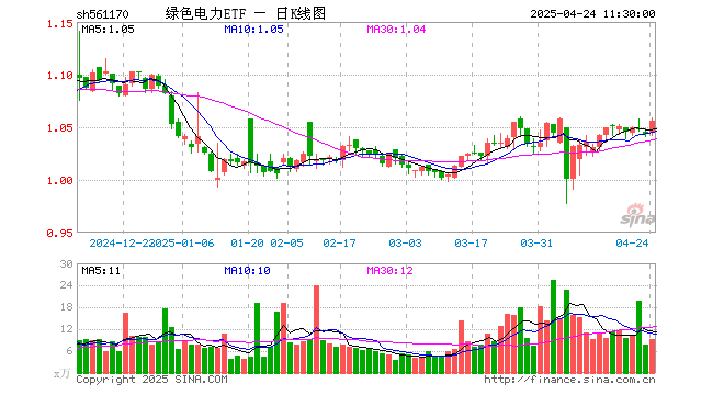 4月24日,截止午间收盘,绿色电力ETF(561170)涨1.25%,报1.056元,成交额958.74万元。绿色电力ETF(561170)重仓股方面,长江电力截止午盘涨0.86%,三峡能源涨0.24%,中国核电跌0.32%,国电电力涨0.00%,国投电力涨1.58%,川投能源涨1.39%,华能国际涨1.13%,浙能电力涨1.59%,华电国际涨2.27%,申能股份涨2.52%。