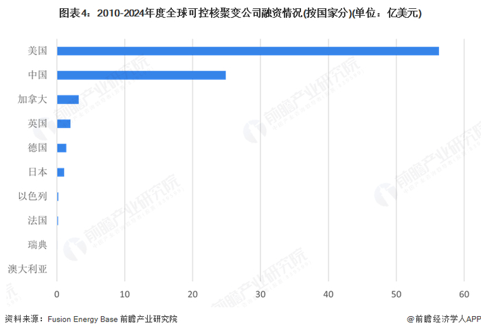 根据聚变能源基地(Fusion Energy Base)综合FIA统计数据,从获得融资的核聚变企业数量分布上看,美国核聚变公司在2010-2024年度累积获得融资56.3亿美元,全球领先;中国以24.9亿美元位居第二;第三名加拿大仅3.21亿美元。从全球可控核聚变企业融资上看,以美国为首,中国追赶的格局明显。