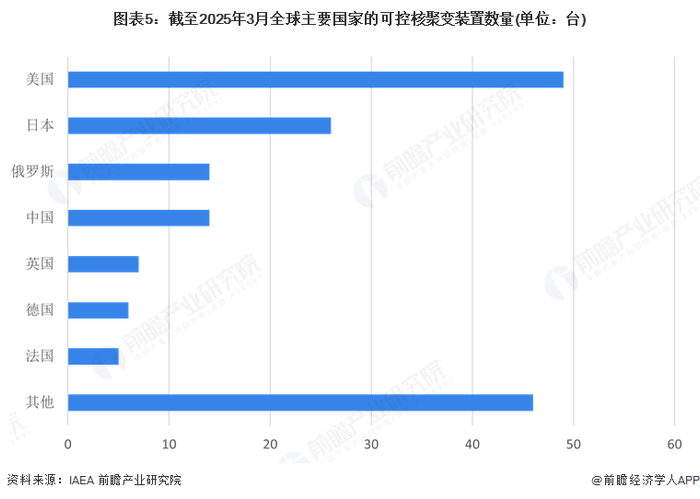 从各国拥有的可控核聚变装置数量上看,根据国际原子能机构(IAEA)聚变装置信息系统(FUSDIS),截至2025年3月27日,美国拥有49台可控核聚变装置,位列全球第;日本以26台居于全球第二;俄罗斯和中国分别以14台并列全球第三。综合来看,美国对可控核聚变投入及建设成果较为显著,保持全球竞争优势。