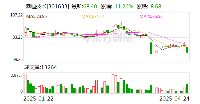 每经AI快讯,4月24日,新股及次新股震荡走弱,港迪技术跌超10%,佳力奇跌超8%,宏工科技、天和磁材、浙江华业纷纷下挫。