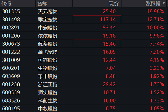 A股宠物消费概念持续走高,天元宠物、源飞宠物双双涨停,中宠股份此前封板,路斯股份涨超20%,金河生物、乖宝宠物、豪悦护理、佩蒂股份等涨幅居前。