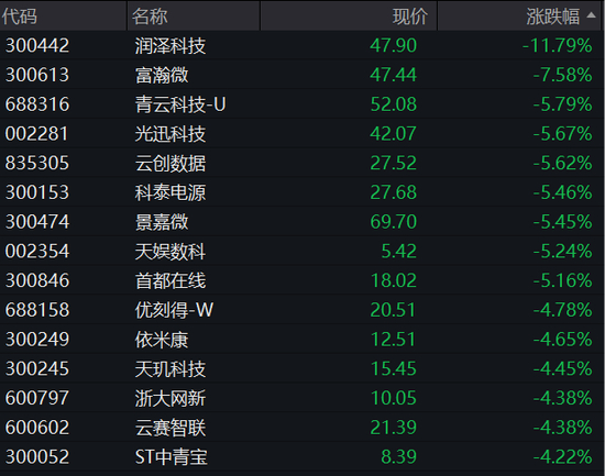 AI算力板块中,润泽科技、富瀚微、青云科技等股跌幅居前,其中润泽科技跌超10%。