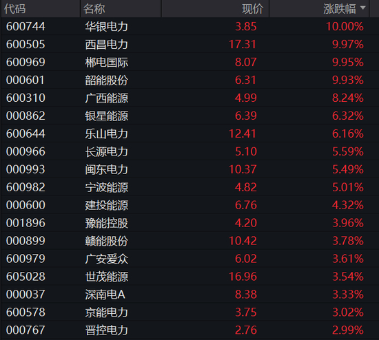 电力股中,华银电力、西昌电力、郴电国际等股涨停,韶能股份、广西能源、乐山电力、长源电力等纷纷跟涨。
