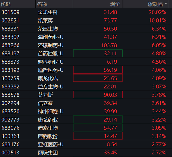 创新药早盘拉升,金凯生科、河化股份、灵康药业涨停,凯莱英逼近涨停,迈威生物、昊帆生物、荣昌生物、罗欣药业等多股涨逾5%。
