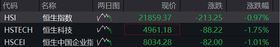 香港恒生指数跌幅扩大至1%。恒生科技指数跌近2%。科技股跌幅居前,京东、美团分别跌超4%和3%。